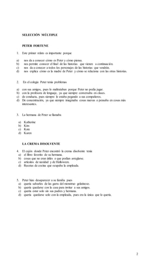 Este documento presenta las instrucciones y contenido de una prueba de lectura sobre el libro "En las nubes" de Peter Fortune. Explica las reglas generales de acentuación y da instrucciones sobre el desarrollo de la prueba, la cual contiene preguntas de selección múltiple y respuestas de desarrollo basadas en la lectura. También incluye una hoja de respuestas para que el estudiante complete allí sus respuestas.