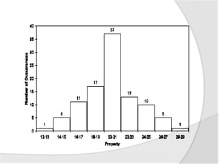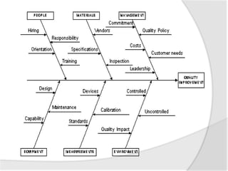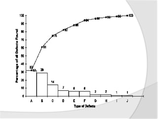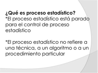 El documento habla sobre el proceso estadístico de control de calidad. Explica que el proceso estadístico es una filosofía de mejora continua que usa herramientas estadísticas como gráficas y análisis para tomar decisiones y mejorar la calidad y productividad. Algunas de las herramientas comúnmente usadas incluyen diagramas de causa y efecto, histogramas, gráficas de control y diagramas de Pareto. El objetivo final es maximizar los beneficios mejorando continuamente el proceso.