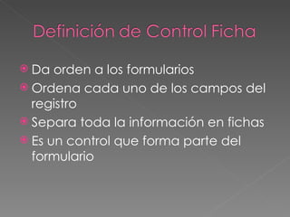 Este documento proporciona instrucciones para organizar campos en formularios de Access usando controles de ficha. Estas instrucciones incluyen cómo agregar un control de ficha al formulario, configurar sus propiedades como nombre, color y efectos, y llenar los campos en la vista de formulario. También explica cómo agregar etiquetas de cálculo al formulario para resolver problemas matemáticos introduciendo datos.