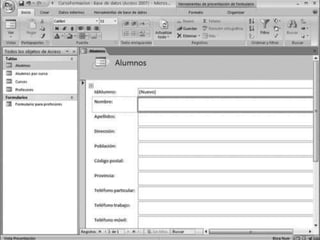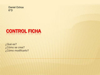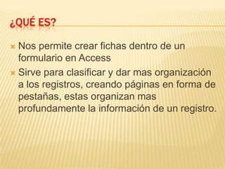 Control Ficha permite crear pestañas en formularios de Access para organizar mejor la información. Se crea agregando una ficha al formulario y luego agregando pestañas y campos. Se pueden modificar los títulos de pestañas y arrastrar campos. Campos Calculados son campos que realizan operaciones matemáticas con datos de otros campos, creándolos con una fórmula usando campos numéricos existentes.
