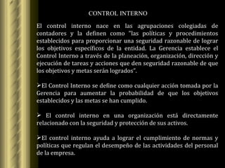 El documento define el control interno como el sistema establecido por una entidad para asegurar que sus objetivos se cumplan de manera eficiente y eficaz. Incluye políticas, procedimientos, normas y mecanismos de verificación. El control interno busca proteger los recursos de la organización y garantizar la confiabilidad de la información. Se compone de componentes como el entorno de control, evaluación de riesgos, actividades de control, información y comunicación, y supervisión.
