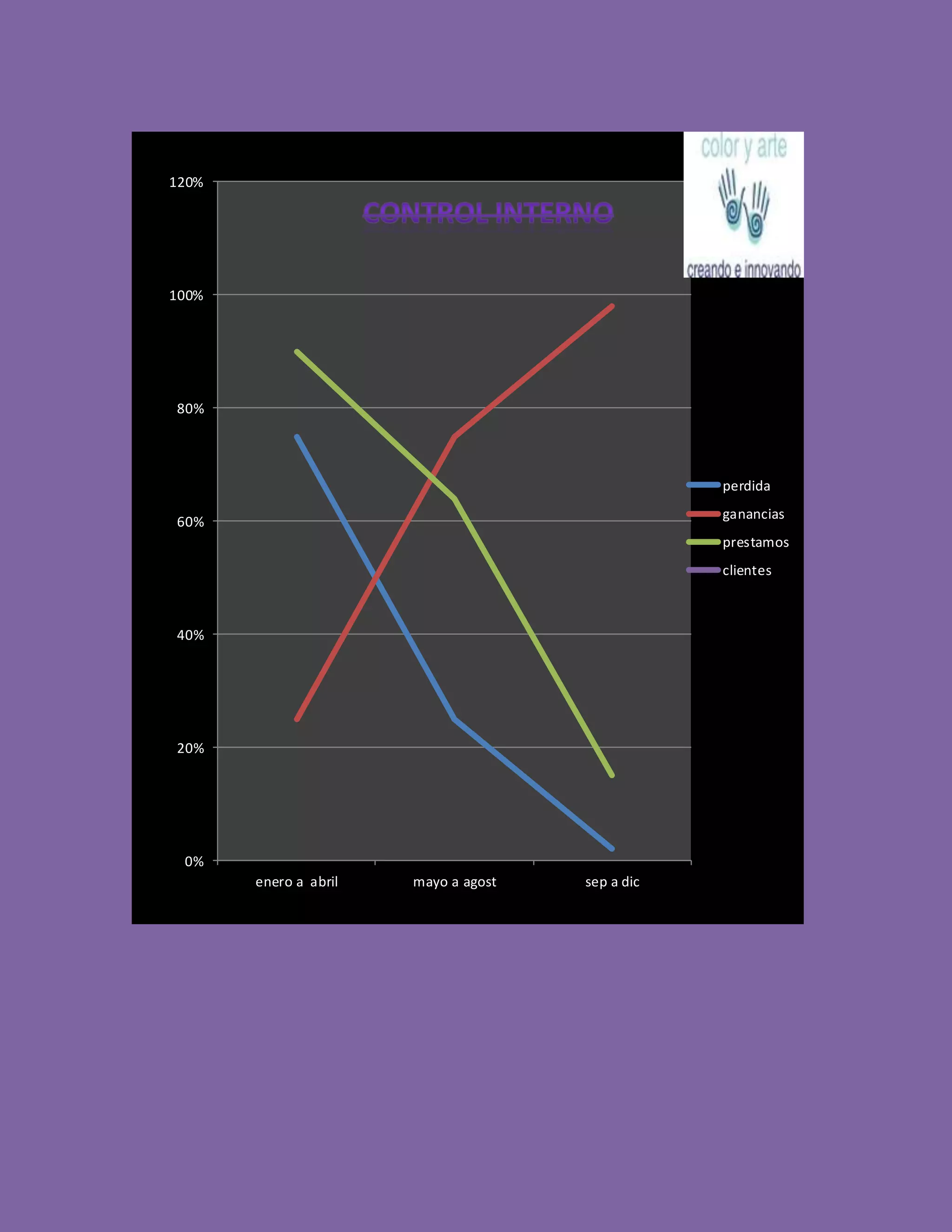 El gráfico muestra las ganancias, pérdidas, préstamos y clientes de una empresa en tres periodos de cuatro meses cada uno. Las ganancias fueron mayores en el segundo periodo, mientras que las pérdidas fueron mayores en el primero y tercero.