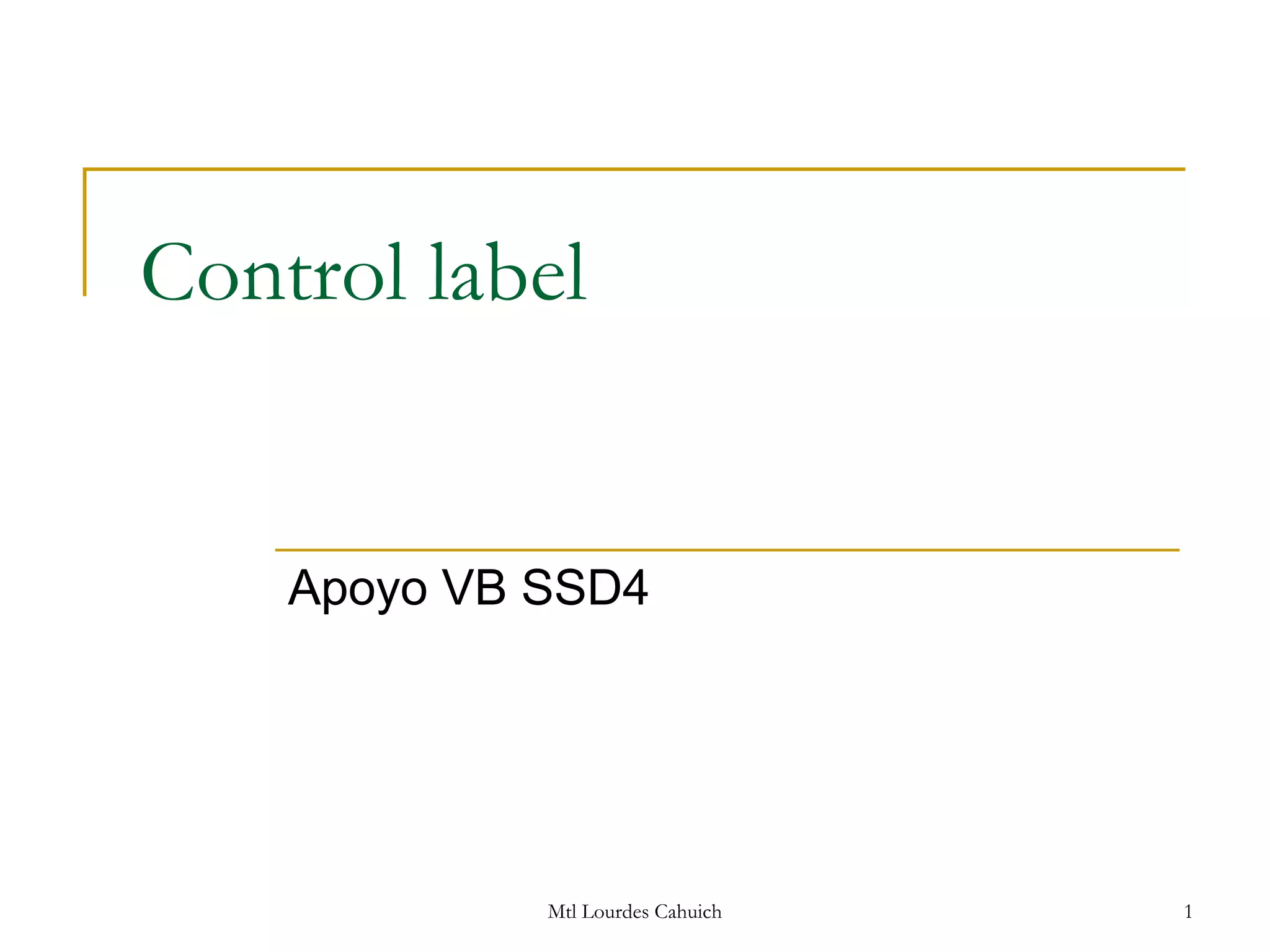 El control Label en VB se utiliza para mostrar texto y descripciones. Su propiedad más importante es Caption, que establece el texto mostrado. Si la propiedad Autosize está en True, el ancho y alto del Label se ajustarán al texto, mientras que si está en False usará el ancho y alto establecidos. La propiedad Alignment alinea el texto a la izquierda, derecha o centro. Los eventos incluyen Click, Change y MouseMove.