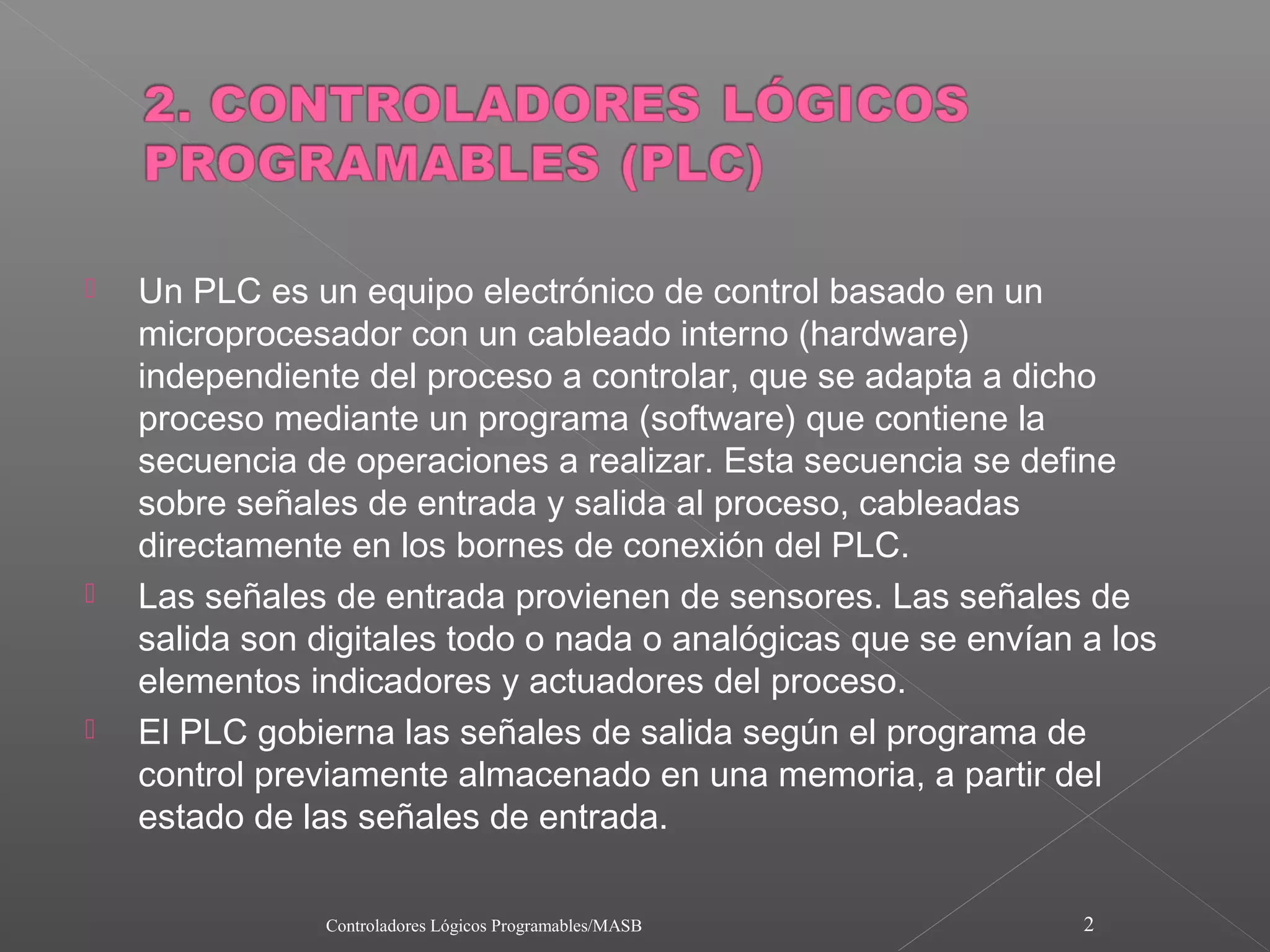 Un PLC es un controlador electrónico programable basado en un microprocesador. Se compone de una unidad central de proceso, módulos de memoria, interfaces de entrada y salida, y fuente de alimentación. El PLC recibe señales de entrada de sensores, ejecuta un programa de control almacenado para gobernar las señales de salida a actuadores según el estado de las entradas.