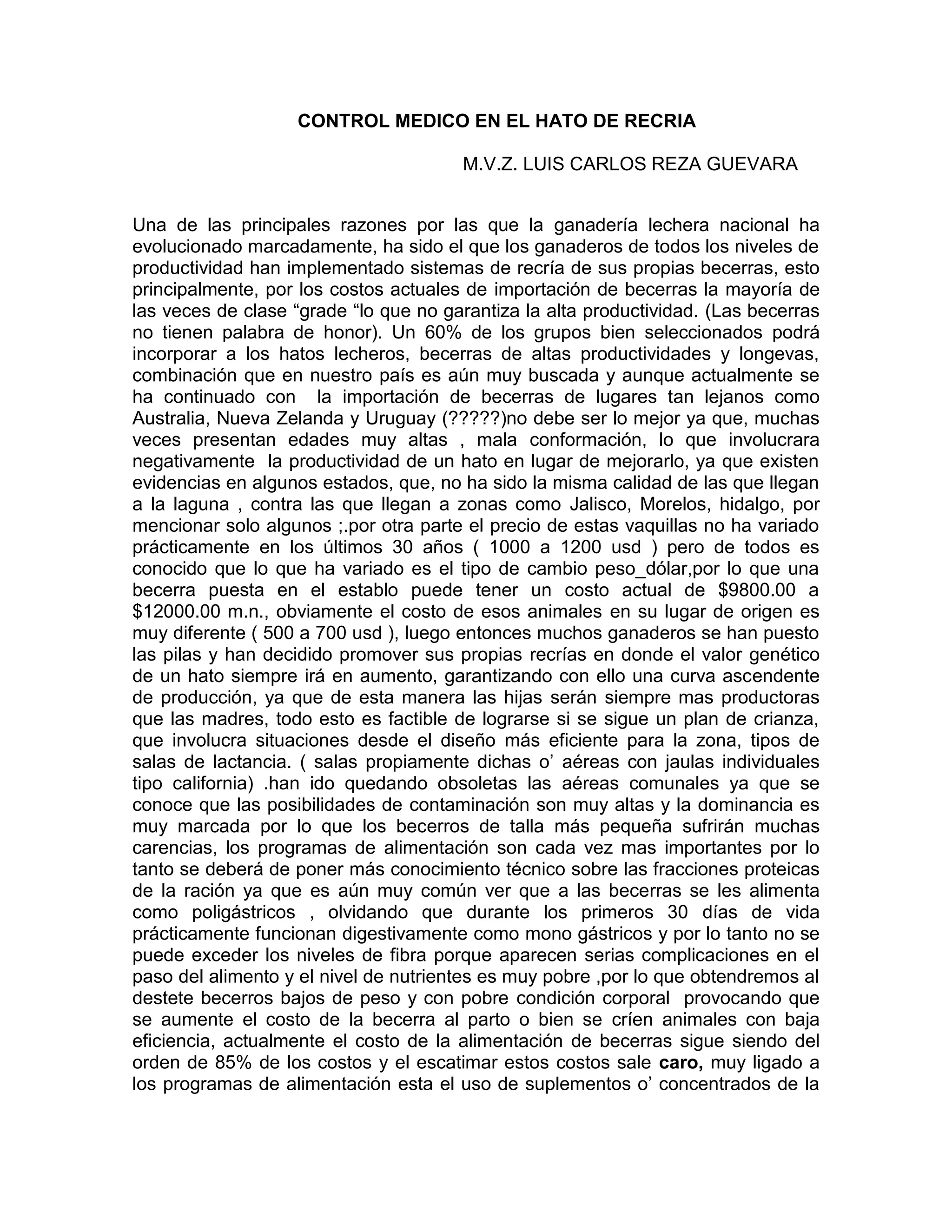 Este documento describe los principales aspectos que debe considerar un médico veterinario zootecnista para el control médico en un hato de cría, incluyendo programas de vacunación, alimentación, prevención de enfermedades y manejo en las diferentes etapas de desarrollo de las terneras desde el nacimiento hasta la gestación.