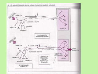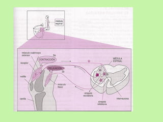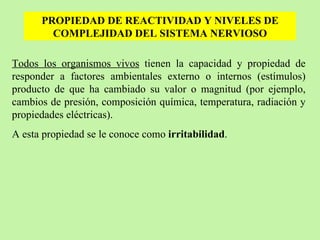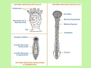 (1) El documento describe los diferentes sistemas de integración y coordinación nerviosa en organismos, desde los más simples hasta los más complejos como los humanos. (2) A medida que los organismos evolucionan, sus sistemas nerviosos se vuelven más especializados y centralizados hacia la cabeza, lo que permite respuestas más rápidas y complejas. (3) El sistema nervioso humano está altamente integrado y compuesto por varios niveles de procesamiento de la información.