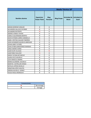 Este documento presenta una tabla con los nombres de los estudiantes de los grados 10° y 11° de Media Técnica y las actividades que han entregado para la clase. En la tabla se especifica si cada estudiante entregó o no las actividades de Power Point, blog personal, blog grupal, Word y Excel, así como su participación en otros proyectos multimedia. La tabla incluye convenciones para indicar quienes entregaron o no cada actividad.