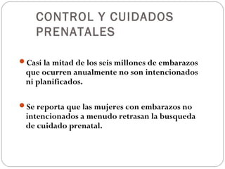 El documento describe los cuidados y controles prenatales que deben recibir las mujeres embarazadas. Casi la mitad de los embarazos son no planificados y muchas mujeres retrasan la búsqueda de atención prenatal. Es importante que las mujeres tengan un plan establecido antes del embarazo dado que muchas etapas de desarrollo fetal ocurren temprano cuando aún no saben que están embarazadas. La atención prenatal incluye consultas iniciales y de seguimiento con exámenes médicos, de laboratorio y estudios complementarios,