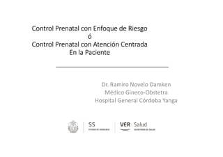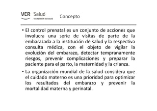 El documento describe el control prenatal con enfoque de riesgo y atención centrada en la paciente. Explica que el control prenatal involucra visitas regulares a la institución de salud para monitorear el embarazo, detectar riesgos tempranos y prevenir complicaciones. También describe los algoritmos utilizados para sistematizar el proceso de atención, incluyendo la evaluación de edad gestacional, comorbilidades, vigilancia prenatal y tamizaje de patologías como diabetes e hipertensión. El objetivo final es crear alianzas entre