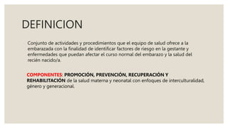 El resumen describe el control prenatal, que incluye actividades y procedimientos realizados por el equipo de salud para identificar factores de riesgo en la embarazada y enfermedades que puedan afectar el embarazo y la salud del recién nacido. Se recomiendan al menos 5 consultas que incluyen exámenes médicos, detección de enfermedades, educación sobre el embarazo y factores de riesgo. El control prenatal busca promover la salud materna y neonatal a través de enfoques de interc