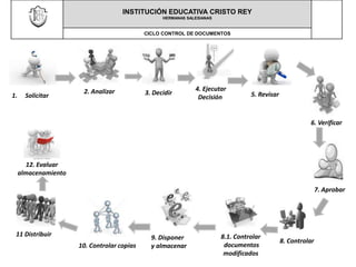 El documento presenta varios diagramas de flujo que describen diferentes procesos de una institución educativa, incluyendo procesos de control de registros y documentos, ciclos para felicitaciones, quejas y sugerencias, procedimientos de acción correctiva y preventiva, auditorías, y compras. Cada diagrama detalla las etapas y pasos involucrados en cada proceso respectivo.