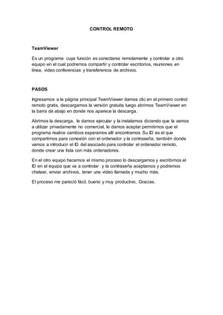TeamViewer es un programa gratuito que permite controlar remotamente otro equipo mediante la entrada de un ID y contraseña, lo que facilita compartir escritorios, reuniones en línea, videoconferencias y transferencia de archivos entre equipos. Para conectarse remotamente, el usuario descarga e instala TeamViewer en ambos equipos e ingresa el ID del equipo que se desea controlar.