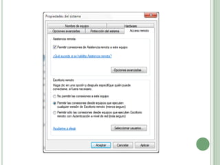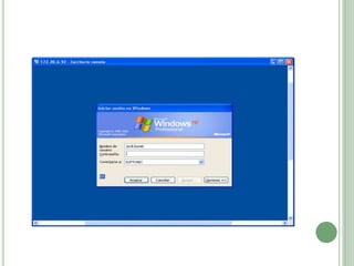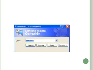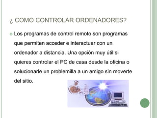 Este documento describe cómo controlar un ordenador de forma remota en 4 pasos: 1) Habilitar los servicios de control remoto en el ordenador remoto, 2) Configurar el firewall, 3) Averiguar la dirección IP del ordenador remoto, y 4) Activar la conexión utilizando el cliente de Escritorio Remoto de Microsoft e introduciendo la dirección IP. Explica que los programas de control remoto permiten acceder e interactuar con un ordenador de forma remota y que existen diferentes opciones como aplicaciones independientes o servicios gestionados.