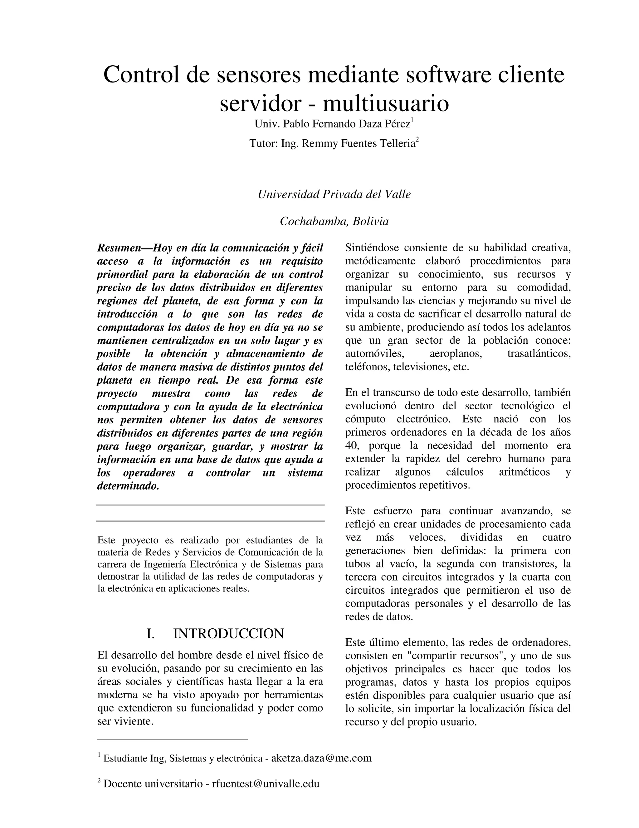 El documento presenta un análisis sobre el control de sensores mediante un software cliente-servidor multiusuario, destacando la importancia de las redes de computadoras y la evolución de la tecnología electrónica. Explica la historia del desarrollo de las redes, desde sus inicios en la década de 1950 hasta la creación de Internet, y su impacto en la comunicación y el acceso a la información. Además, se discuten protocolos de red, su estructura y tipos, así como la función de los dispositivos de red en la interconexión y gestión de recursos.