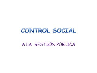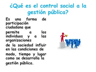 La gestión pública se refiere a las actividades de planeación, ejecución, control y evaluación que realizan los organismos públicos para mejorar el bienestar de los ciudadanos de acuerdo con la ley. El control social a la gestión pública permite que los ciudadanos y organizaciones influyan en cómo se desarrolla la gestión pública a través de la participación. Los objetivos del control social son construir confianza entre el Estado y la sociedad civil, garantizar que la gestión pública sirva al interés general, y prevenir la corrupción. Existen vari