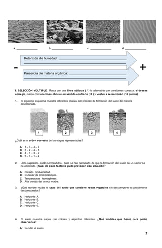 Este documento presenta un examen de Ciencias Naturales sobre suelos. Contiene preguntas sobre las propiedades de diferentes tipos de suelos, incluida su capacidad para retener humedad y materia orgánica. También incluye preguntas sobre los procesos de formación del suelo y las características distintivas de los horizontes y capas del perfil del suelo.