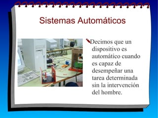 Este documento describe los componentes básicos de los sistemas de control automáticos, incluyendo las entradas, la unidad de control y las salidas. También describe varias controladoras comunes como Enconor, Cnice, Investrónica y BSP, destacando sus características de entrada y salida. Finalmente, explica el uso de una controladora para conectar dispositivos físicos a un ordenador de forma segura.