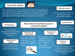 El documento presenta diferentes herramientas estadísticas para el control de calidad como histogramas, diagramas de Pareto, diagramas de causa-efecto y diagramas de dispersión. Explica que estas herramientas ayudan a clasificar y ordenar información sobre características de calidad para identificar y priorizar problemas y sus causas, así como estudiar la relación entre variables.