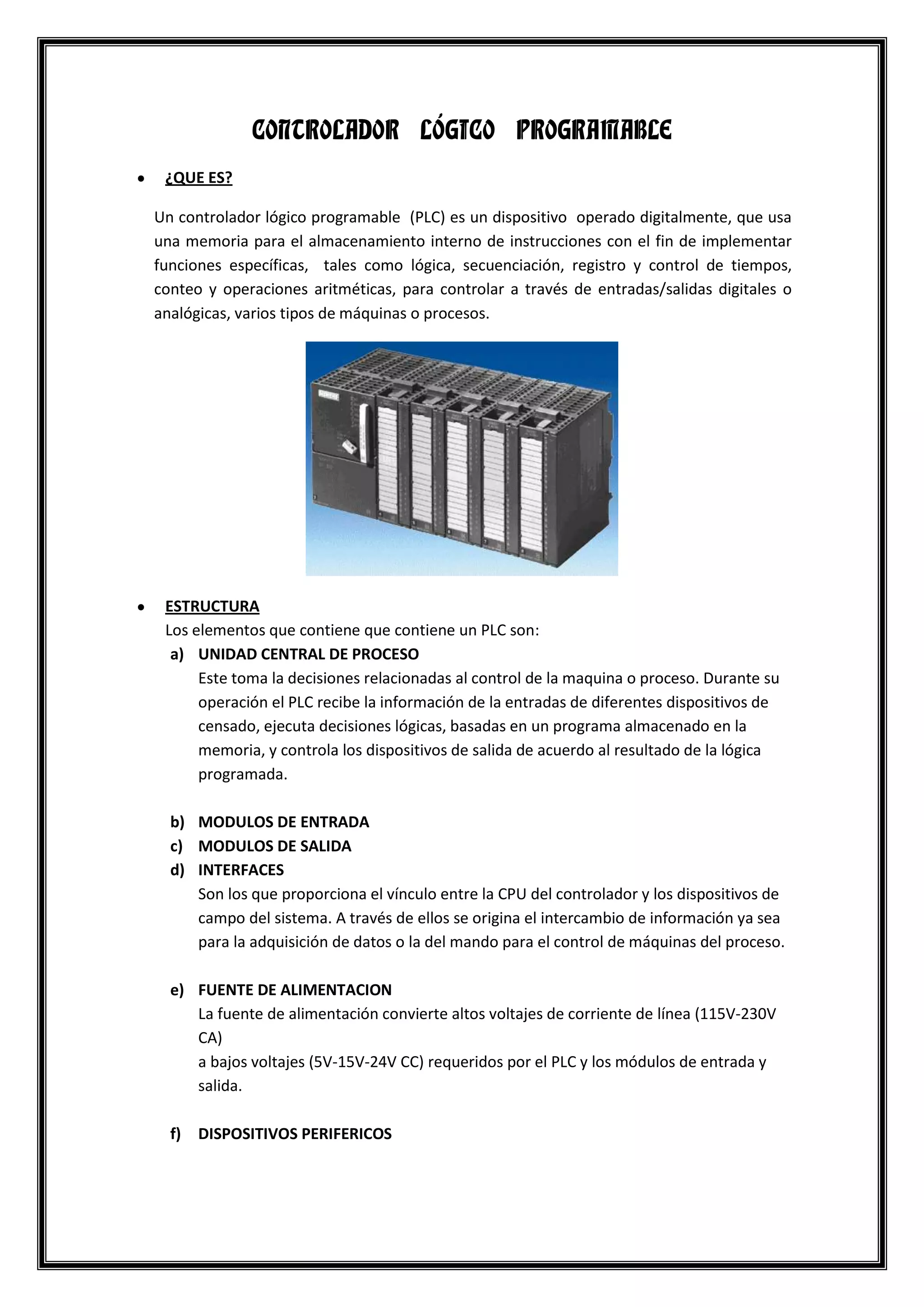 Un controlador lógico programable (PLC) es un dispositivo digital que usa una memoria para almacenar instrucciones e implementar funciones de control como lógica, secuenciación, control de tiempo y operaciones de entrada/salida para controlar máquinas o procesos. Los PLC tienen una unidad central de proceso, módulos de entrada y salida, interfaces y fuente de alimentación. Ejecutan programas en un ciclo continuo de lectura de entradas, ejecución del programa y escritura de salidas.