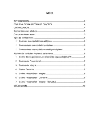 Este documento describe los diferentes tipos de controladores, incluyendo controladores analógicos, digitales y híbridos. También explica las diferentes acciones de control como control de dos posiciones, control proporcional, integral, derivativo y combinaciones de estos. El objetivo principal de un controlador es mantener una variable controlada dentro de rangos previamente establecidos mediante la detección y corrección de errores.