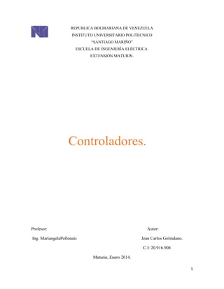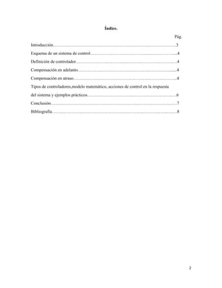 Este documento describe los diferentes tipos de controladores industriales, incluyendo controles de dos posiciones, proporcionales, integrales, proporcionales e integrales, proporcionales y derivativos, y proporcionales, derivativos e integrales. Explica los modelos matemáticos y acciones de control de cada tipo de controlador, así como ejemplos prácticos de su uso en aplicaciones industriales y domésticas.