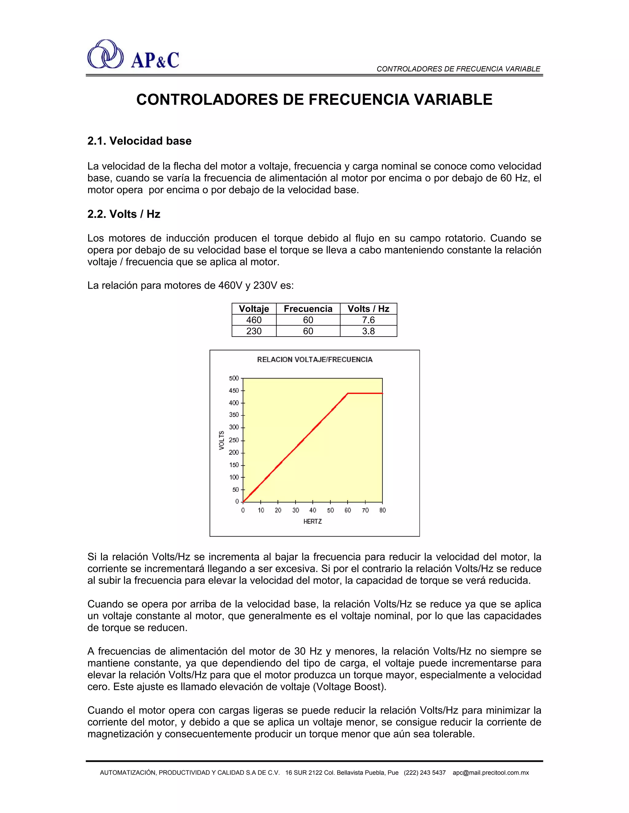 Este documento describe los controladores de frecuencia variable y sus componentes. Explica que un controlador consta de un rectificador que convierte la corriente alterna de la línea en corriente directa y un inversor que convierte la corriente directa en una señal de corriente alterna de frecuencia ajustable para alimentar al motor. También describe los diferentes tipos de cargas comunes como bombas, ventiladores y cómo los controladores de frecuencia variable pueden controlar dichas cargas de manera eficiente variando la frecuencia y voltaje aplicados al motor.
