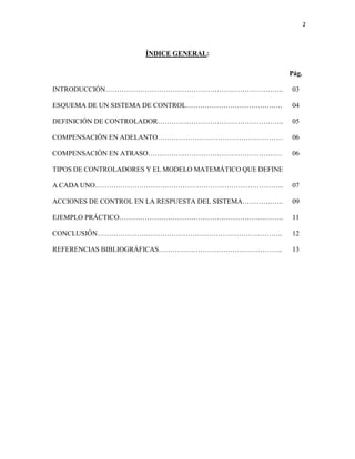 El documento aborda el tema de los sistemas de control, explicando sus componentes básicos como sensores, controladores y actuadores, y detalla diferentes tipos de controladores industriales y sus acciones de control respectivas. Se destacan conceptos como compensación en adelanto y atraso, y se presentan ejemplos prácticos para ilustrar el funcionamiento de los controladores. La conclusión resalta la importancia de los sistemas de control en diversas aplicaciones industriales y la necesidad de que los ingenieros y científicos comprendan esta teoría.