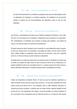 Este documento explica los conceptos de controladores, BIOS y cómo configurarlos. Brevemente, los controladores permiten que el hardware se comunique con el sistema operativo, el BIOS controla el arranque del sistema y la configuración de dispositivos, y su configuración incluye opciones como la fecha y hora, discos duros, memoria y parámetros del procesador.