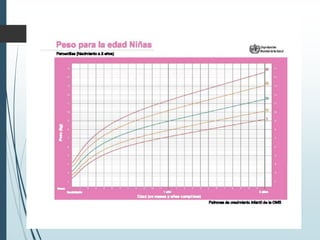 Este documento describe los aspectos fundamentales del control del niño sano, incluyendo las consultas recomendadas según la edad, los parámetros que se evalúan en cada consulta como el crecimiento, desarrollo y vacunación, y los criterios de referencia al segundo nivel. Explica los conceptos clave de crecimiento como peso, talla, perímetro cefálico e IMC, así como las leyes y períodos del desarrollo psicomotor en la infancia.