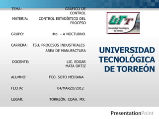 Este documento presenta un gráfico de control estadístico y analiza los datos utilizando las reglas de Nelson y Western Electric. El resumen encuentra que dos puntos están fuera del límite de tres desviaciones estándar y hay una tendencia de puntos a estar ligeramente fuera de control, indicando que el proceso no está completamente bajo control estadístico. También encuentra que los puntos se alternan en dirección, aumentando y disminuyendo, según la regla 4 de Nelson. El gráfico de control ayuda a evaluar la calidad del proceso median