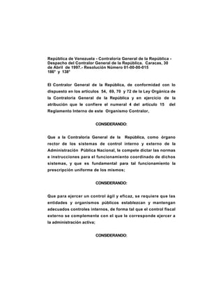 Este documento establece normas generales de control interno para organismos y entidades públicas en Venezuela. Define los objetivos y principios del control interno, así como las responsabilidades de los diferentes niveles jerárquicos en su implementación y evaluación. Se enfoca en asegurar la protección del patrimonio público, la exactitud de la información y la eficiencia de los procesos institucionales.