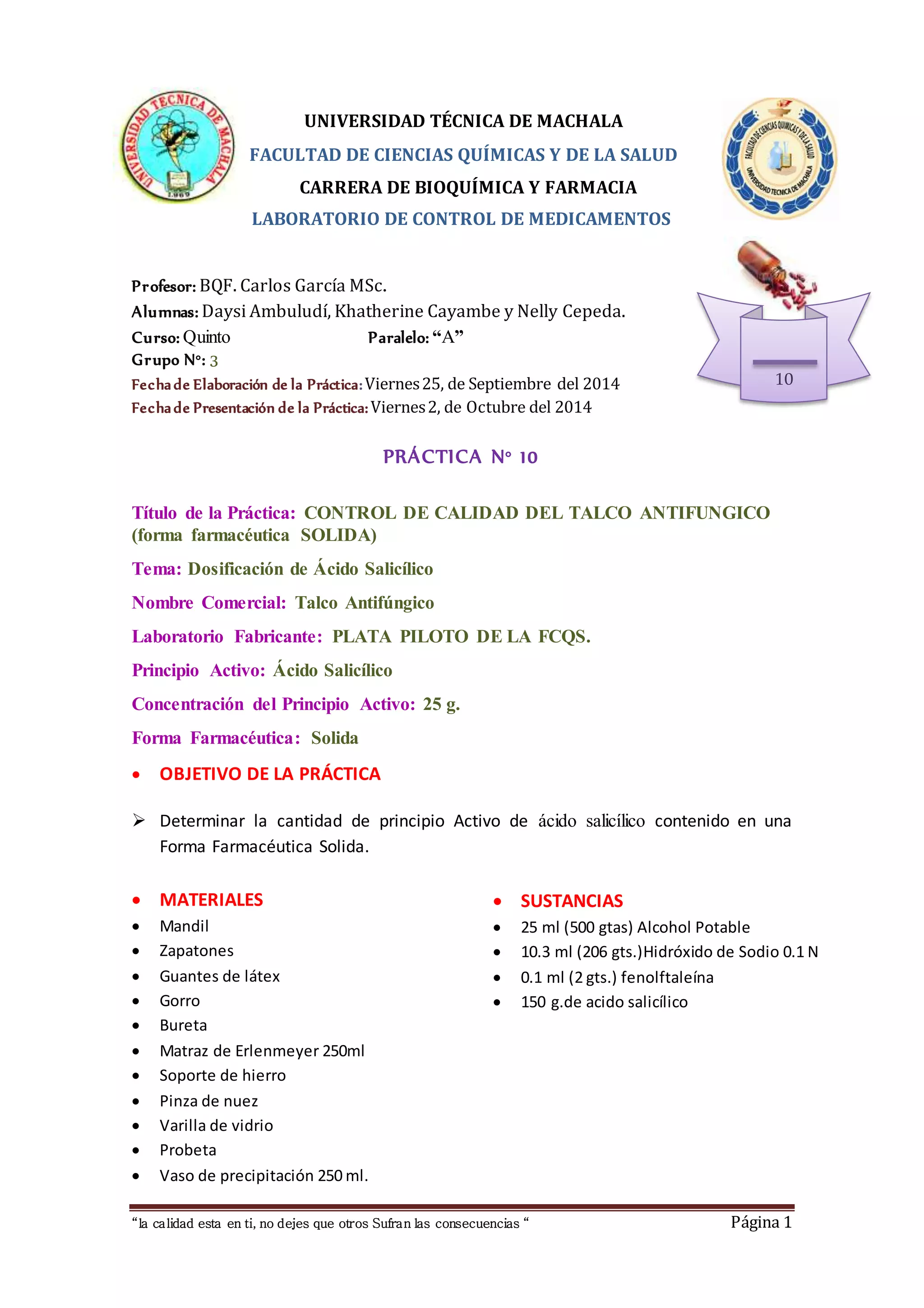 Las estudiantes realizaron un control de calidad de un talco antifúngico para determinar la cantidad de principio activo, ácido salicílico, que contenía. Pesaron una cantidad de polvo que debía contener 150 mg de ácido salicílico y lo disolvieron en alcohol potable antes de titularlo con NaOH 0.1N usando fenolftaleína como indicador. Los cálculos mostraron que contenía un 94.83% de principio activo, dentro de los parámetros establecidos, por lo que el talco fue aprobado.