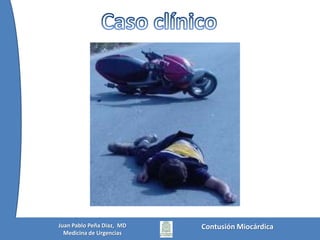 Este documento presenta el caso de un paciente de 46 años que fue atropellado por una camioneta y sufrió una posible contusión miocárdica. Describe los síntomas y hallazgos del paciente, incluido el colapso con baja frecuencia cardíaca y presión arterial. Explica los posibles diagnósticos y las pruebas realizadas, como electrocardiogramas y niveles elevados de troponina. Finalmente, resume la historia, mecanismos, presentación clínica, diagnóstico y hallazgos electrocardiográ