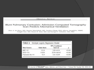 La contusión pulmonar es una de las lesiones más comunes en pacientes con trauma torácico y puede presentarse de leve a severa. Se recomienda optimizar la ventilación y oxigenación, controlar el dolor, restaurar la mecánica pulmonar y usar antibióticos y esteroides. La ventilación mecánica no invasiva y la estabilización costal pueden reducir la necesidad de intubación y mejorar los resultados.