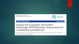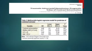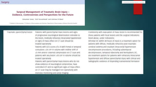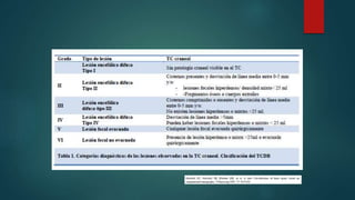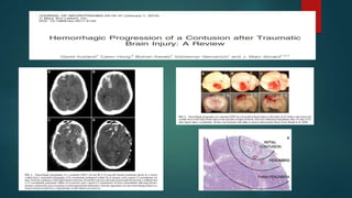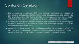 Las contusiones cerebrales son lesiones corticales que causan necrosis y hemorragias múltiples. Pueden ser graves, medianas o leves dependiendo de su tamaño y extensión. Los principales factores pronósticos incluyen la edad, el estado de conciencia inicial, la presencia de fracturas craneales y la presión intracraneal. La cirugía se recomienda para contusiones mayores a 30 cc que causen deterioro neurológico o presión intracraneal elevada refractaria al tratamiento médico. La craneotomía es el