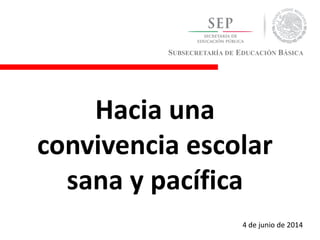 El documento describe varias estrategias para promover una convivencia sana y pacífica en las escuelas. Señala que los resultados académicos son mejores cuando el clima escolar es positivo. También destaca la importancia de fortalecer a los equipos de adultos en las escuelas, incluyendo profesores, directores y padres de familia. Además, propone trabajar en las habilidades socioemocionales de estudiantes y maestros para mejorar las relaciones interpersonales.