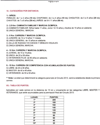 Este documento anuncia el 3er Circuito "Corriendo por MI salud 2013" en Aguascalientes, México, el cual consta de 4 carreras a realizarse entre febrero y septiembre. Detalla las fechas, distancias, categorías, premios e inscripciones de cada carrera, así como la premiación final basada en la acumulación de puntos. El objetivo es promover estilos de vida saludables a través del deporte.