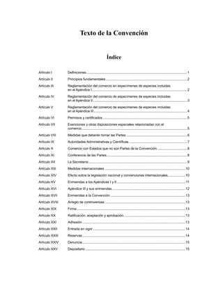 Este documento presenta el texto de la Convención sobre el Comercio Internacional de Especies Amenazadas de Fauna y Flora Silvestres. Establece regulaciones estrictas para el comercio de especies en peligro de extinción listadas en el Apéndice I, regulaciones para el comercio de especies potencialmente en peligro en el Apéndice II, y cooperación para el comercio de especies reguladas nacionalmente en el Apéndice III. También designa autoridades científicas y administrativas, establece permisos de importación