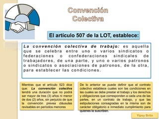 El documento aborda la regulación de la convención colectiva de trabajo en relación con el contrato colectivo, señalando que debe establecer las condiciones laborales y derechos y obligaciones de empleadores y trabajadores. Destaca la obligatoriedad de las estipulaciones acordadas y los procedimientos para su negociación, así como el principio de efecto expansivo y automático de tales convenios sobre todos los trabajadores. Se enfatiza la importancia de la representación sindical en la negociación colectiva y las condiciones de afiliación al sindicato.