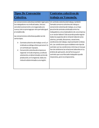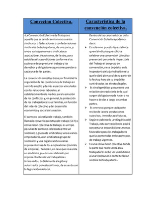 La convención colectiva es un acuerdo entre sindicatos de trabajadores y empleadores para establecer las condiciones laborales. Su objetivo es regular ampliamente las condiciones de trabajo y resolver conflictos de manera de proteger a los trabajadores. Existen convenciones colectivas de empresa y regionales. Las convenciones colectivas establecen las condiciones mínimas para las relaciones laborales en su ámbito y los contratos individuales no pueden empeorar esas condiciones.