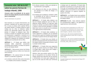 El Convenio núm. 138 de la OIT establece la obligación de los países de fijar una edad mínima para el empleo infantil y prohibir el trabajo infantil peligroso, asegurando la protección de los menores en el ámbito laboral. El Convenio núm. 182 complementa esto al exigir que se tomen medidas urgentes para erradicar las peores formas de trabajo infantil, definiendo estas prácticas como violaciones graves de los derechos de los niños. Ambos convenios buscan abolir el trabajo infantil y garantizar el bienestar y desarrollo adecuado de los menores.