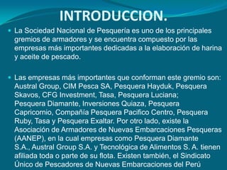 Este documento describe la Asociación de Armadores de Nuevas Embarcaciones Pesqueras (AANEP) y el Sindicato Único de Pescadores de Nuevas Embarcaciones del Perú (SUPNEP), incluyendo su historia y el convenio colectivo que firmaron en 1991. El convenio establece que los pescadores recibirán el 18% del precio promedio de la pesca descargada y ha sido renovado varias veces. El objetivo del convenio es hacer frente a la crisis del sector pesquero mediante el establecimiento de condiciones laborales