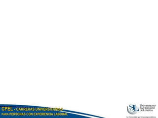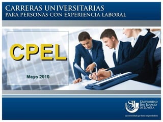 La Universidad San Ignacio de Loyola ofrece un programa de Administración de Empresas llamado CPEL dirigido a personas con y sin estudios superiores previos. El programa dura 2 años y 8 meses y se compone de 10 ciclos de 4 meses cada uno con clases los martes, miércoles y jueves por la noche o los sábados. Para ingresar, se requiere experiencia laboral calificada de al menos 4 años y aprobar una evaluación de competencias o aptitud académica. El plan de estudios se enfoca en el desarrollo de competencias