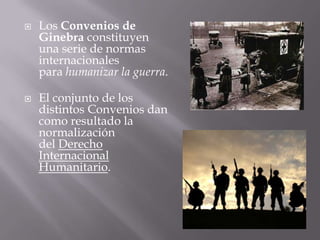 Las Convenciones de Ginebra constituyen una serie de normas internacionales para humanizar la guerra, incluyendo la Primera Convención de 1864 sobre el tratamiento de militares heridos, la Segunda de 1906 sobre militares heridos en el mar, la Tercera de 1929 sobre heridos y prisioneros de guerra, y la Cuarta de 1949 para proteger a víctimas de la guerra. Estas convenciones normalizan el derecho internacional humanitario y se aplican en tiempos de conflicto armado entre gobiernos que las han ratificado.