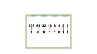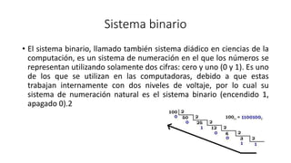 El documento describe los sistemas binario y decimal de numeración. El sistema binario representa números utilizando solo dos cifras (0 y 1) y es el sistema utilizado por las computadoras. El sistema decimal utiliza diez cifras (0-9) y es la base del sistema de numeración común. Además, proporciona ejemplos de cómo convertir números entre los sistemas binario y decimal.