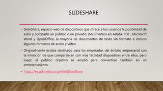 El documento habla sobre tres sitios web para compartir documentos: SlideShare, Scribd y Calameo. SlideShare permite compartir presentaciones, documentos y algunos archivos de audio y video. Scribd permite publicar y compartir documentos en diversos formatos como PDF, txt y ppt. Calameo ofrece una plataforma para crear y publicar revistas, folletos y otros documentos a partir de archivos PDF.