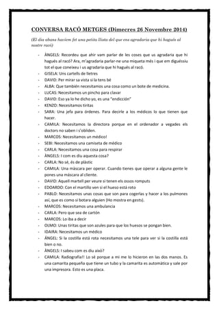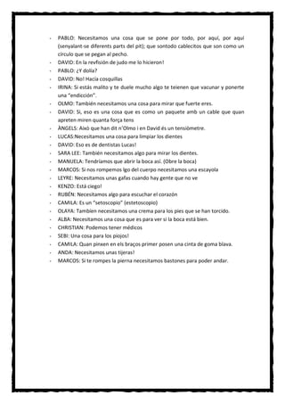 Los niños discuten las cosas que les gustaría tener en su rincón de médicos, incluyendo carteles, instrumentos para examinar la vista y los huesos, medicinas, tiritas, una máscara para operar, una radiografía, un estetoscopio, escayola, gafas y bastones. También mencionan necesitar a un médico, una enfermera, una ambulancia y herramientas para limpiar dientes y revisar la boca.