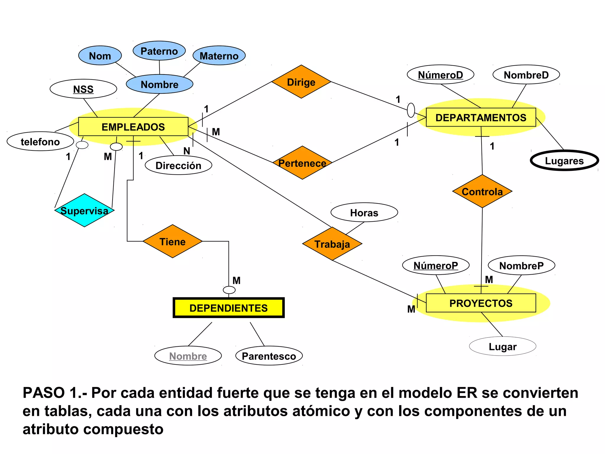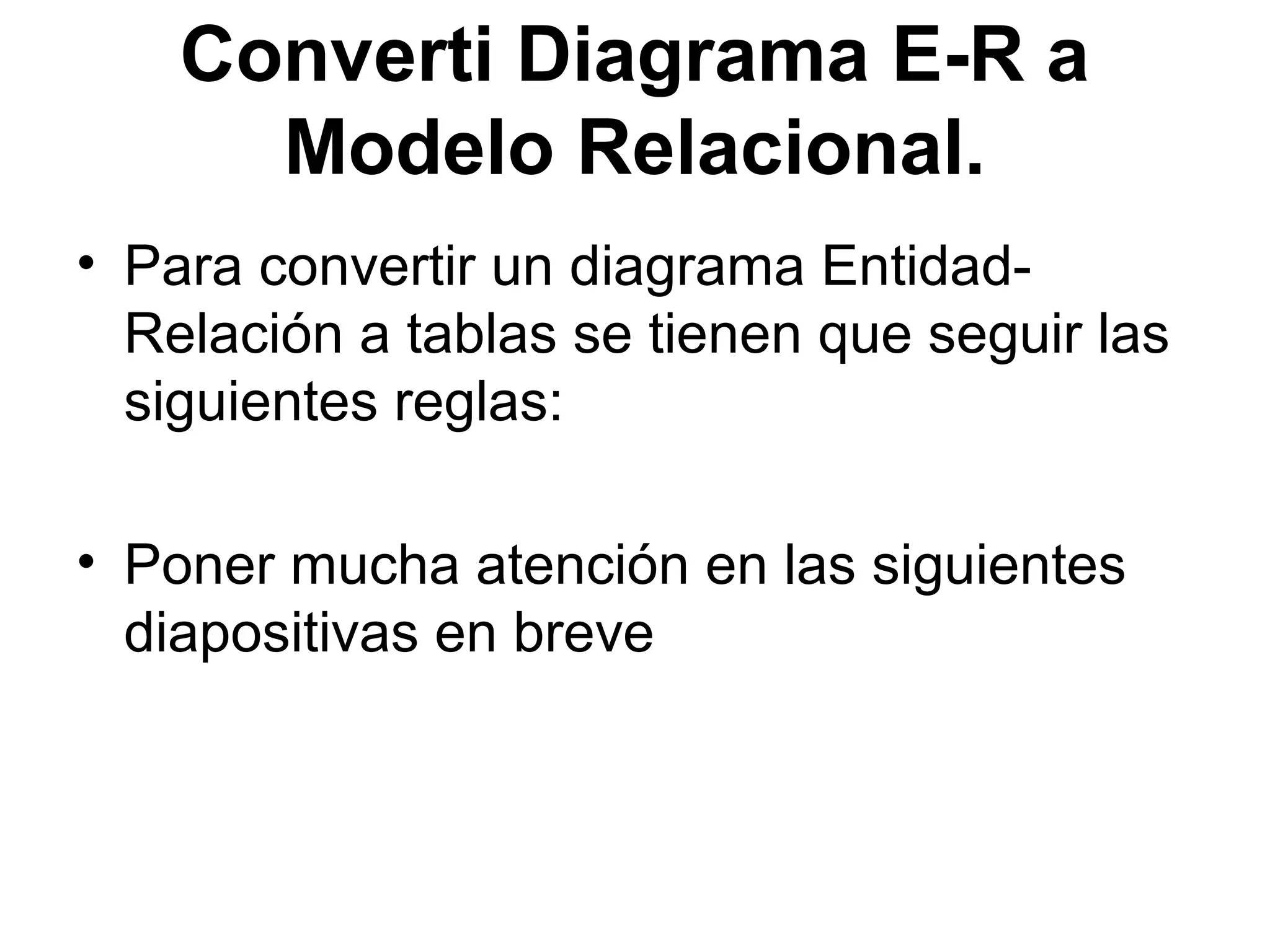 El documento explica el proceso de conversión de un diagrama entidad-relación a un modelo relacional, siguiendo una serie de pasos específicos que incluyen la creación de tablas para entidades fuertes y débiles, y el manejo de relaciones entre entidades. Se detallan reglas sobre cómo tratar vínculos de diferentes cardinalidades (1:1, 1:m, m:n) y atributos multivaluados, así como relaciones recursivas a través de ejemplos como un organigrama y un árbol genealógico. Finalmente, se enfatiza la importancia del modelo entidad-relación extendido para manejar vínculos n-arios en el diseño de esquemas de bases de datos.