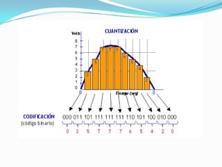 Este documento describe el proceso de conversión analógica-digital y digital-analógica en televisión. Explica la cuantificación y codificación de señales analógicas para su representación digital, así como la reconversión a señales analógicas mediante convertidores digital-analógico. Además, compara señales analógicas y digitales, y analiza ventajas e inconvenientes de ambos formatos.