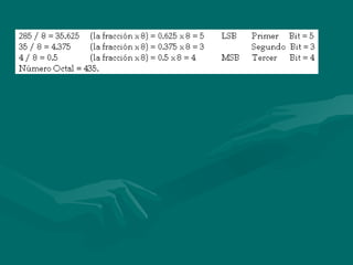 Este documento explica cómo convertir números entre diferentes sistemas de numeración, incluyendo la conversión de binario a decimal, decimal a binario, octal a decimal y viceversa, hexadecimal a decimal y viceversa, y cómo el código BCD representa números decimales usando binario.